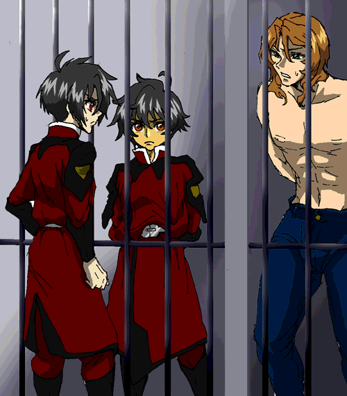 ここは俺達の世界じゃない。 そんなありえない馬鹿らしい結論に至ったのは、もう状況から判断をすれば、仕方のない事だった。 刹那はあっけらかんとした顔をしていたが、こいつの精神と俺の精神は同じレベルじゃない。俺は動揺ぐらいする。みっともない醜態を晒すわけはないけれど。 だってありえないだろう。こんな大きな戦艦見たこともないし、この戦艦で任務をこなすクルー達のPCキーパンチの手さばきやら恐ろしい程の記憶力など色々と、通常の人間では有り得ない程、機敏で俊敏だった。 彼らが「コーディネーター」という、細胞やらDNAを弄った人間だという事を知ったのは、わりと直ぐ。それを聞いて、あぁなるほどなとロックオンはあっさりと受け止め落ち着いた。 そりゃあ、俺達の出る幕じゃねぇ。 こんな世界、俺達は知っているわけないな。 さて。どうしたものか。 ロックオンは、手錠でつながれた不便な両手で、腕を組もうとし、出来ずにため息を吐いた。 「ため息をつきたいのは僕なんだけどねぇ」 目の前の黒い士官服を着た男が言う。 この小さな取調室には、2人の男がロックオンを見つめていた。 目の前には黒い軍服に身を包んだ、ぱっと見、うだつのあがらない男がいる。先ほどから質問を繰り返してくるが、どれも答えられるようなものではない。 もう1人は、壁際で腕を組んだまま、じっと見つめてくる濃青の髪の若い男で、この男からの方が、ずっと威厳を感じる。あの男は出来る男なのだろう。目の前の、黒軍服の男1人だけが相手ならば、逃げ出す事は簡単のようにも思えたが、いかんせんこの軍艦は広い。逃げ出すにしても、ここが俺達の世界でないのならば何処に逃げ出したらいいのやら。 ここで俺が眠ったら、次に目が醒めたら元に戻ってるかもしれない。そんな事を思いながら何度も目を閉じてみるが、どうやらそれは不発のようだ。 まったく、どうしたもんだろうか。 隣の部屋では、刹那が取調べを受けているようだった。この「ザフト軍:戦闘艦ミネルバ」の中で。 「どうしてMSの中に居たのかな、君は」 「……」 黒服の男の同じ質問。何度目だ。 答えられるわけがない。気がついたら、こんな事になっていたんだと答えれば、彼らは納得するのだろうか。 昨晩眠りに入って、眼を覚ましたら、MSの中に居た。しかも見慣れないMSの。 (せっかく…刹那と寝てたのにコレか…) 昨日の夜。セックスが終わった直後。いつもならベッドから出ていってしまう刹那は、珍しく…というより、はじめてロックオンの腕の中に居た。驚いた。前代未聞だ。どうしたんだ一体と思ったが、どうやらもう眠りに入っているらしい刹那は、すぅすぅと穏やかな寝息を立てている。身体を丸めてロックオンの胸に収まる刹那の髪を梳いた。 ----他人と一緒に眠れるようになったのか、刹那。 どれだけ心を許してくれたのか。その変化が嬉しくて、たまらない。抱き締めたい。この小さな身体を抱き締めてやりたいのに、刹那を起こしたくはなくて、手を伸ばせない。 愛しくてたまらない。この時間が少しでも長く続く事を祈った。 同じベッドで幸せな眠りについたはずなのに。起きてみれば、窮屈なMSのコックピットで目覚めた。 なんなんだこれは。 目が醒めた途端、起き上がろうとして天井に頭をぶつけた。見れば、随分と小さなコックピットの中で、ハッチが締まっている。いや、これは航空機だろうか。 痛む頭を抑えながら、強化ガラスの中から外を見れば、腰を抜かしている赤い軍服らしき服を着た少年が1人と、こちらを怪訝な目で見つめる同じく赤い軍服の濃青髪の青年が1人、(それが取調べをしている男だ)そして無数の銃口だった。 …なんだこれは。 自分の姿も昨晩眠ったときと同じ格好で、下着とジーンズをつけているだけで上半身は裸だ。 とりあえずホールドアップするしかない。意味が判らない。なんだこれは。 知らないMS、知らない軍隊。…という事は、ここは基地か戦艦か? ハッチを外部から強制的に開けられて、すぐに手錠をかけられた。言葉が通じるだけマシだと思ったが、どうやら犯罪者扱いされているらしい。 連行されていく途中、ふと見れば、赤い軍服を羽織った刹那が居た。 この軍隊の軍服らしい、赤い上着を羽織った刹那の足は生足だった。あぁ、お前もそのまま飛んできたのか。 「刹那!」 駆け寄ろうとして、銃口に阻まれる。完全に囲まれてしまっていては、逃げようもない。ロックオンはホールドアップした。 刹那は上着だけを与えられたものの、拘束されているようだった。…つまりは敵扱いだ。 そして今に至る。 (…取調べっつってもな…) ソレスタルビーイングの事を話すわけにはいかず、しかし名前も言う気がない。今のところは黙秘を続けているしかない状態だ。不本意だが。 「…君ねぇ…そろそろ喋って欲しいんだけど…黙っていても、ザフトの基地につけば、そこで本格的に取り調べられるだけなんだよ?僕なんかよりもずっと厳