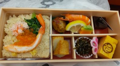 ↑昼の部のお弁当は木挽町広場で買った蟹めし弁当。