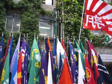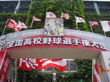 入場ゲートの隣に並んだ、歴代優勝校の校旗。