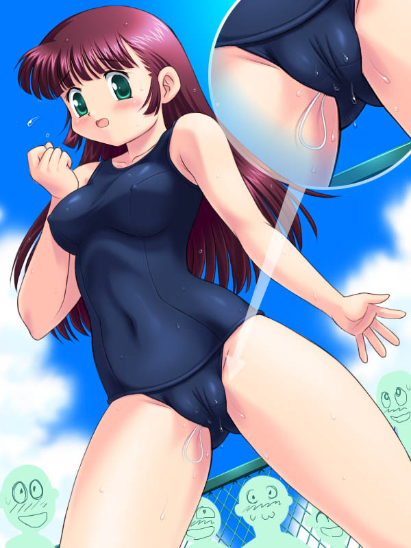 | 女生徒が指さしたのは志穂さんの着ているスク水の股間。そしてそこからはちょろりんとループ状になった『ヒモ』がはみ出していたのです。 (こ、これって……) その正体に志穂さんは思い当たっていました。 ずっと楽しみにしていた屋外プールの授業初日だというのに「お客さん」が来ていた志穂さん、それでもどうしても泳ぎたくって……普段使ったことのない<たんぽん>をつかっていたのでした。 ところが、普段使い慣れないものを使ったものだから、取り出し用についているヒモの処理がおろそかになってしまって…… 「……やだ、もぉ〜〜〜〜〜!」 周囲からの視線の集中砲火を浴びながら股間を押さえながら更衣室に向かって走っていく志穂さん、やっぱ無理してまで泳ぐんじゃなかった、と思わずにはいられないのでした…… |