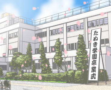 | やや時季はずれに咲いた桜の花びらが舞い散る中、たぬき学園の校舎から生徒達の歌う『仰げば尊し』の合唱が聞こえてきます。 そしてその様子を校庭に佇みながら見つめている人影がありました。……どこか満足げな、そしてどこかさびしげな瞳で。 「とうとうこの日が来たんですネ。たぬき学園の卒業式が」 ふと背後からかけられた声に、『彼』は校舎を見つめたまま答えました。 「ええ。この学園の、最初で最後の卒業式です。帆村先生」 |